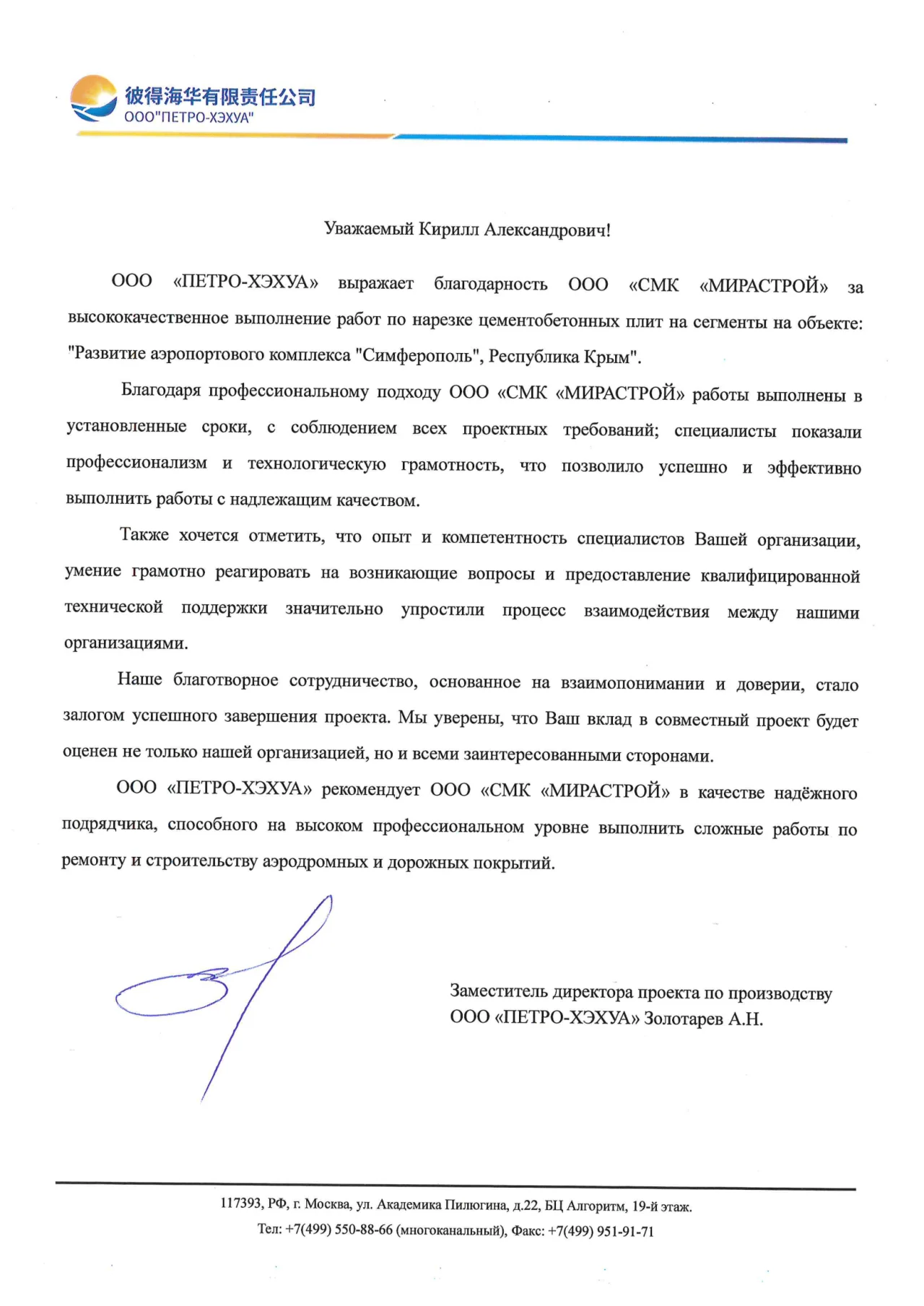 ООО «ПЕТРО-ХЭХУА» выражает благодарность ООО «СМК «МИРАСТРОЙ» за высококачественное выполнение работ по нарезке цементобетонных плит на сегменты на объекте: «Развитие аэропортового комплекса «Симферополь», Республика Крым».